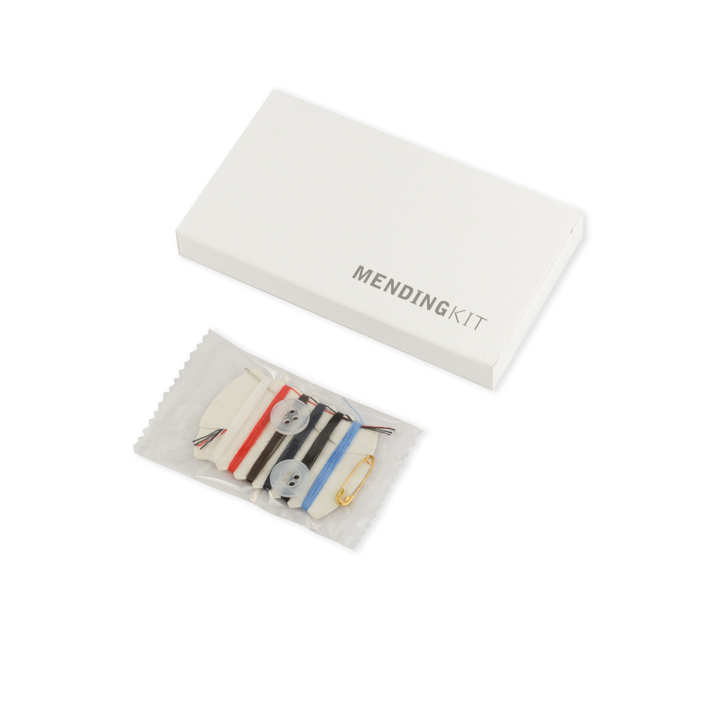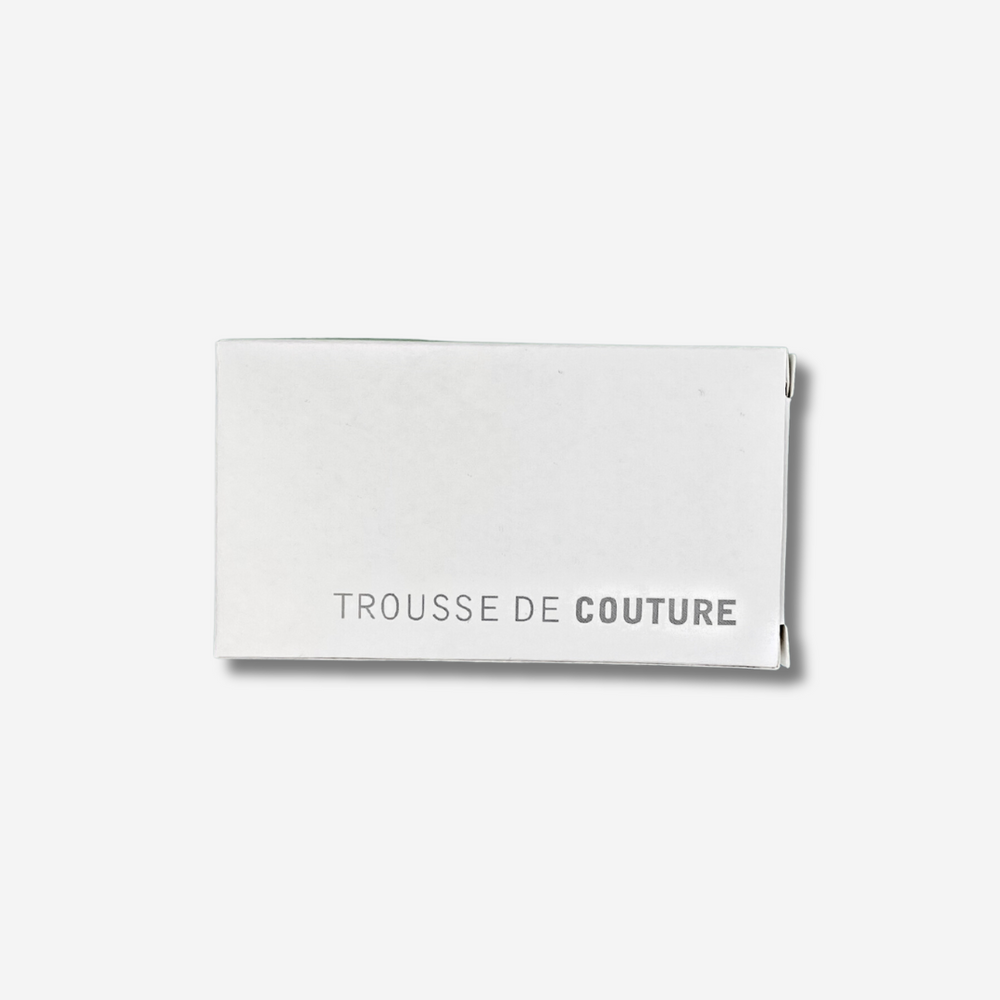 Collection of unbranded amenities with bilingual English/French packaging. Mending kit with sewing essentials: threads, buttons and a safety pin.