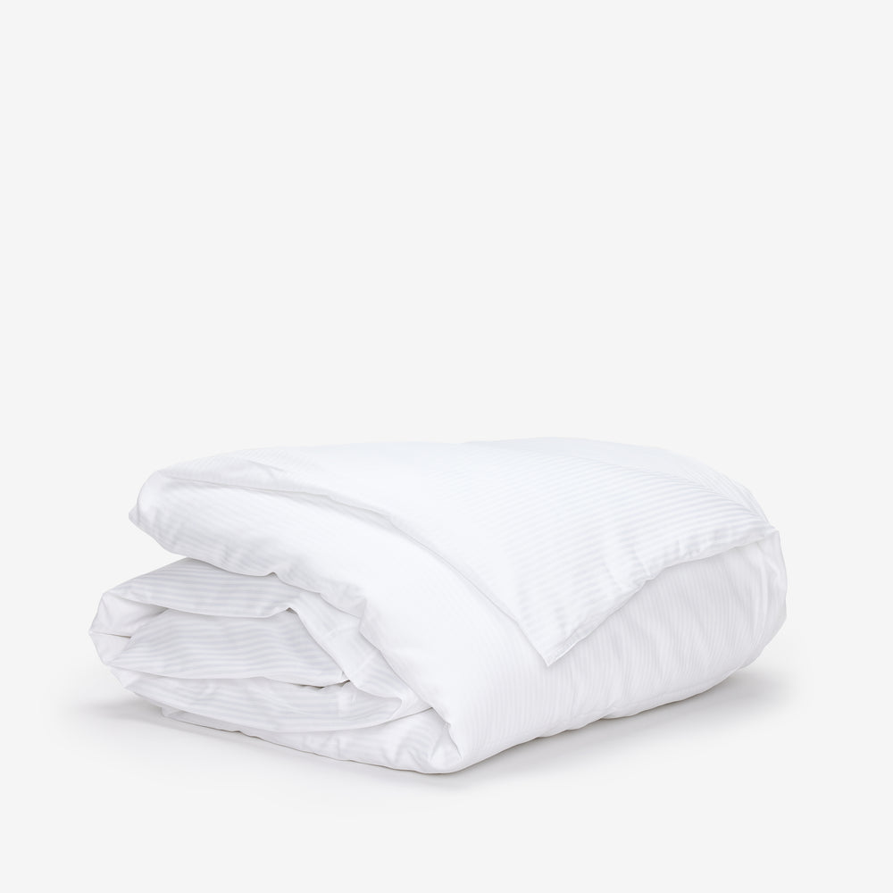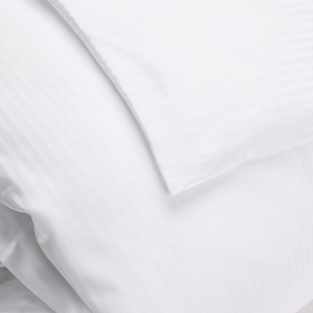 Sophisticated and timeless, the T-250 duvet cover is woven in a monochromatic stripe that effortlessly enhances any room decor. Crafted from a soft and durable polycotton blend, this luxurious 250-thread count fabric features superior long staple cotton resulting in a stronger, more durable fabric. Flap closure with openings at corners holds the duvet securely in place and allows for easy washing and changing.